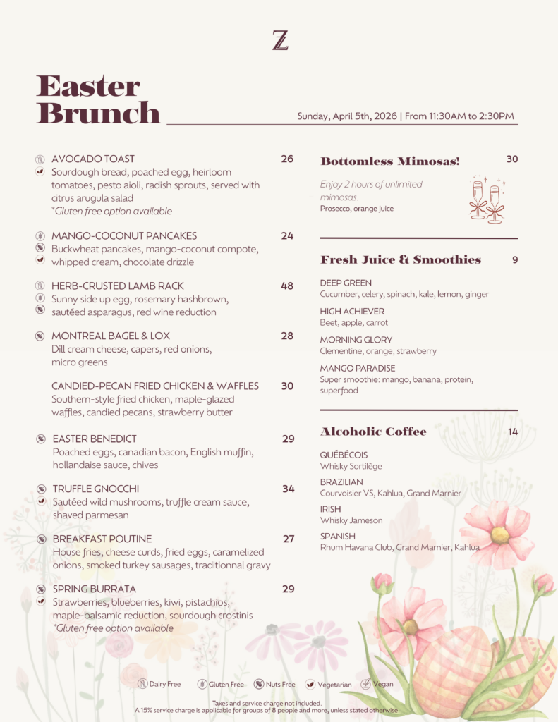 Step into a warm and elegant Montreal setting and indulge in a brunch experience crafted for the season. Savor sweet and savory delights, classic dishes with a modern twist, and gourmet drinks that add a sparkling touch to your celebration. Bring your family and friends together for a festive, memorable Easter filled with flavor, laughter, and a touch of spring magic.